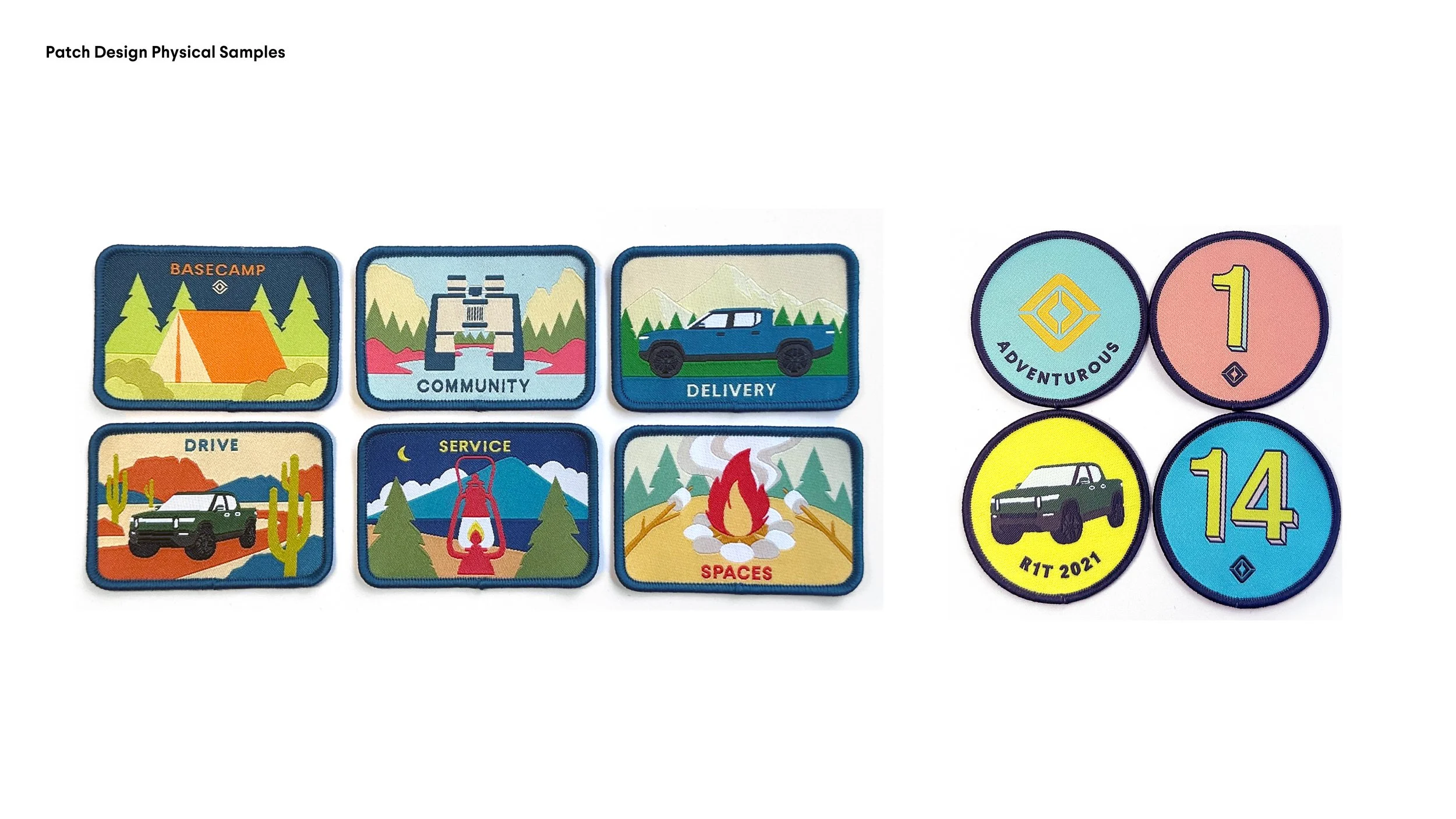 "Basecamp" is an internal onboarding program at Rivian designed to help new employees adapt to the company's culture and equip them with the necessary mindset, knowledge, and skills. Each completed mission within the program is rewarded with a unique patch. During my internship in 2021 as a graphic designer, I created ten types of "Basecamp" patches, each featuring motifs of Rivian vehicles, camping gear, and natural scenery to symbolize different aspects of the program. Additionally, I designed 23 patches for special occasions such as work anniversaries and awards, using Rivian’s Compass value language, as well as for significant company events like vehicle launches.